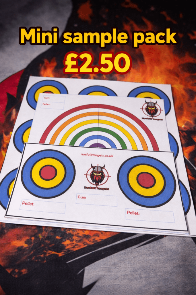 New mini sample pack available at Norfolk Targets, one of each of our 17x17cm, 14x14cm and 7x14cm target targets for £2.50 to have a test and see what woks best for you just click the link https://norfolktargets.co.uk/products/sample-target-pack?variant=52345578324309